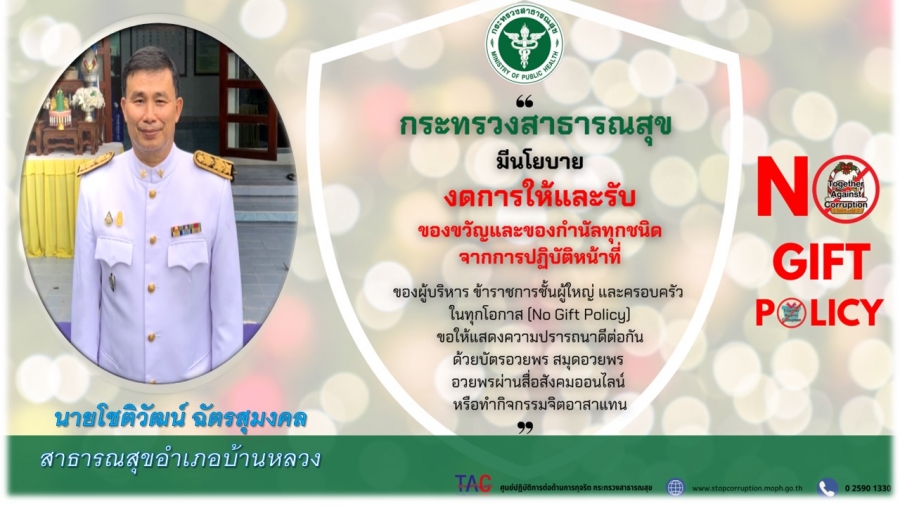 นายโชติวัฒน์ ฉัตรสุมงคล สาธารณสุขอำเภอบ้านหลวง ประกาศนโยบายงดการให้ และรับของขวัญ และ ของกำนัลทุกชนิดจากการปฏิบัติหน้าที่ของผู้บริหาร ข้าราชการชั้นผู้ใหญ่ และครอบครัวในทุกโอกาส ( No Gift Policy ) ขอให้แสดงความปรารถนาดีต่อกันด้วยบัตรอวยพร สมุดอวยพร อวยพรผ่านสื่อสังคมออนไลน์ หรือ ทำกิจกรรมจิตอาสาแทน