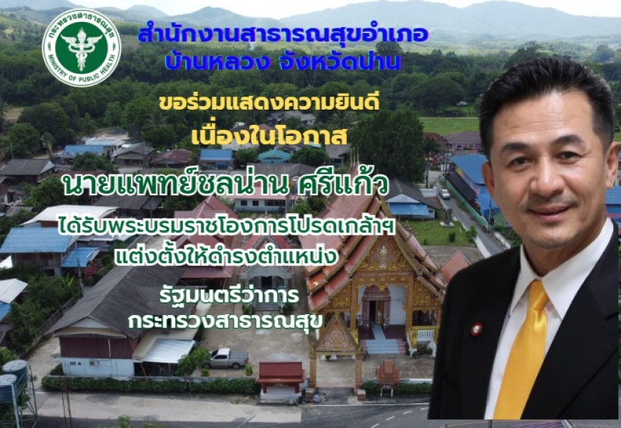 สำนักงานสาธารณสุขอำเภอบ้านหลวงขอแสดงความยินดีกับท่านนายแพทย์ชลน่าน ศรีแก้ว ได้รับพระบรมราชโองการไปรดเกล้าจ