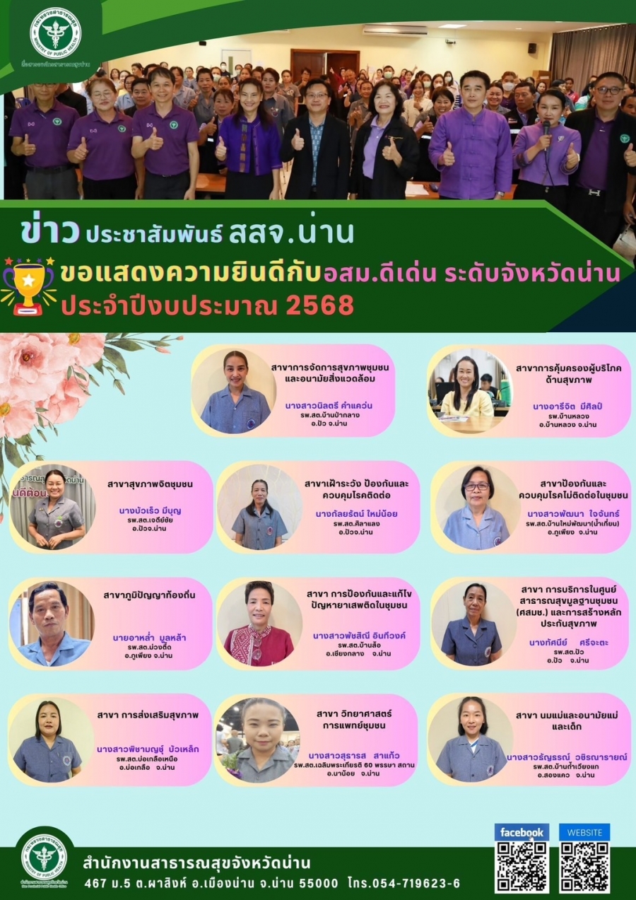 สำนักงานสาธารณสุขอำเภอบ้านหลวง ขอแสดงความยินดีกับ อสม.อารีจิต มีศิลป์ อสม.บ้านป่าคา อำเภอบ้านหลวง จังหวัดน่าน เป็น อสม.ดีเด่น ระดับจังหวัด สาขาการคุ้มครองผู้บริโภคด้านสุขภาพ ประจำปีงบประมาณ 2568