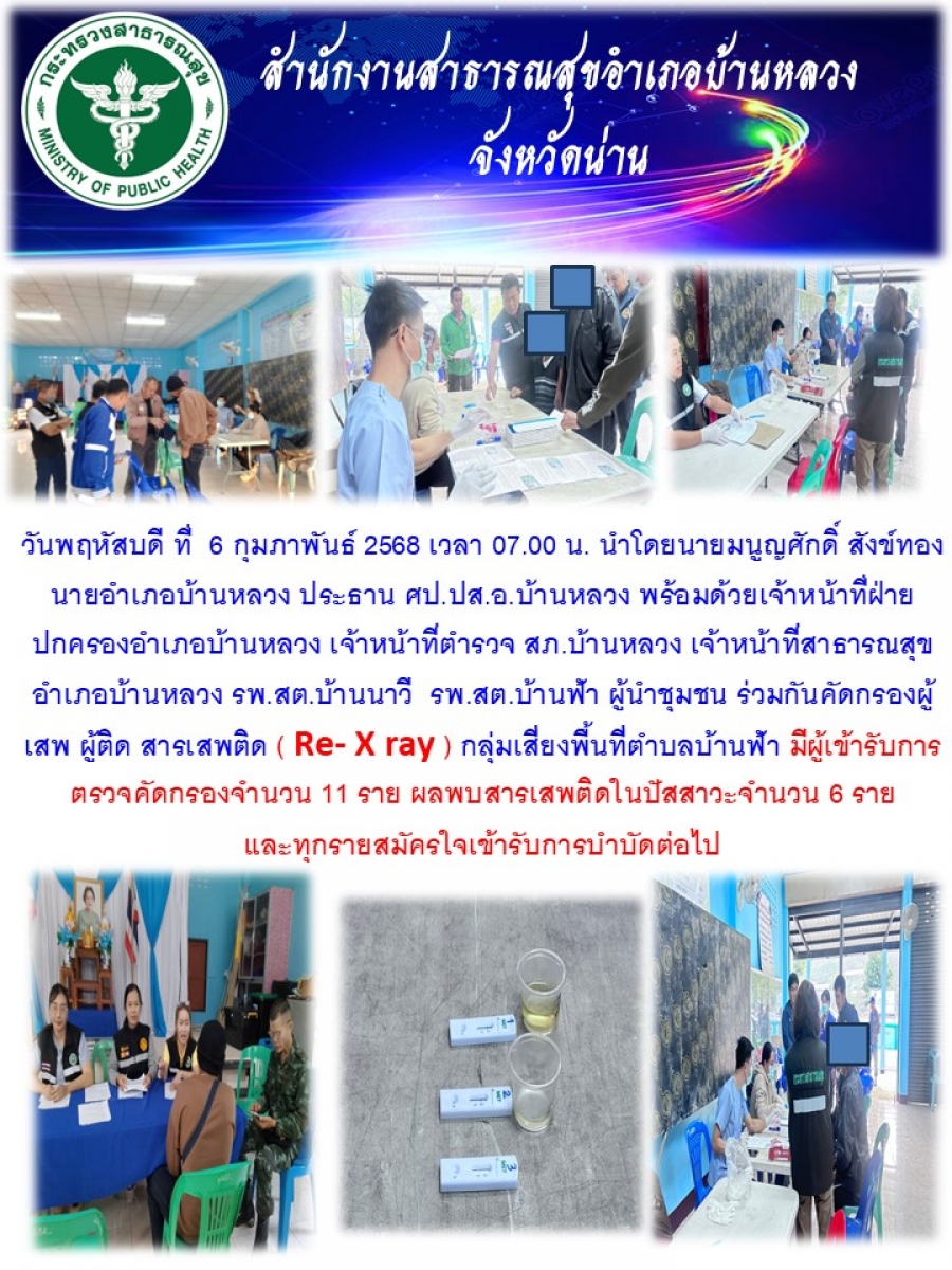 วันพฤหัสบดี ที่ 6 กุมภาพันธ์ 2568 เวลา 07.00 น. นำโดยนายมนูญศักดิ์ สังข์ทอง นายอำเภอบ้านหลวง ประธาน ศป.ปส.อ.บ้านหลวง พร้อมด้วยเจ้าหน้าที่ฝ่ายปกครองอำเภอบ้านหลวง เจ้าหน้าที่ตำรวจ สภ.บ้านหลวง เจ้าหน้าที่สาธารณสุขอำเภอบ้านหลวง รพ.สต.บ้านนาวี รพ.สต.บ้านฟ้า ผู้นำชุมชน ร่วมกันคัดกรองผู้เสพ ผู้ติด สารเสพติด ( Re- X ray ) กลุ่มเสี่ยงพื้นที่ตำบลบ้านฟ้า มีผู้เข้ารับการตรวจคัดกรองจำนวน 11 ราย ผลพบสารเสพติดในปัสสาวะจำนวน 6 ราย และทุกรายสมัครใจเข้ารับการบำบัดต่อไป