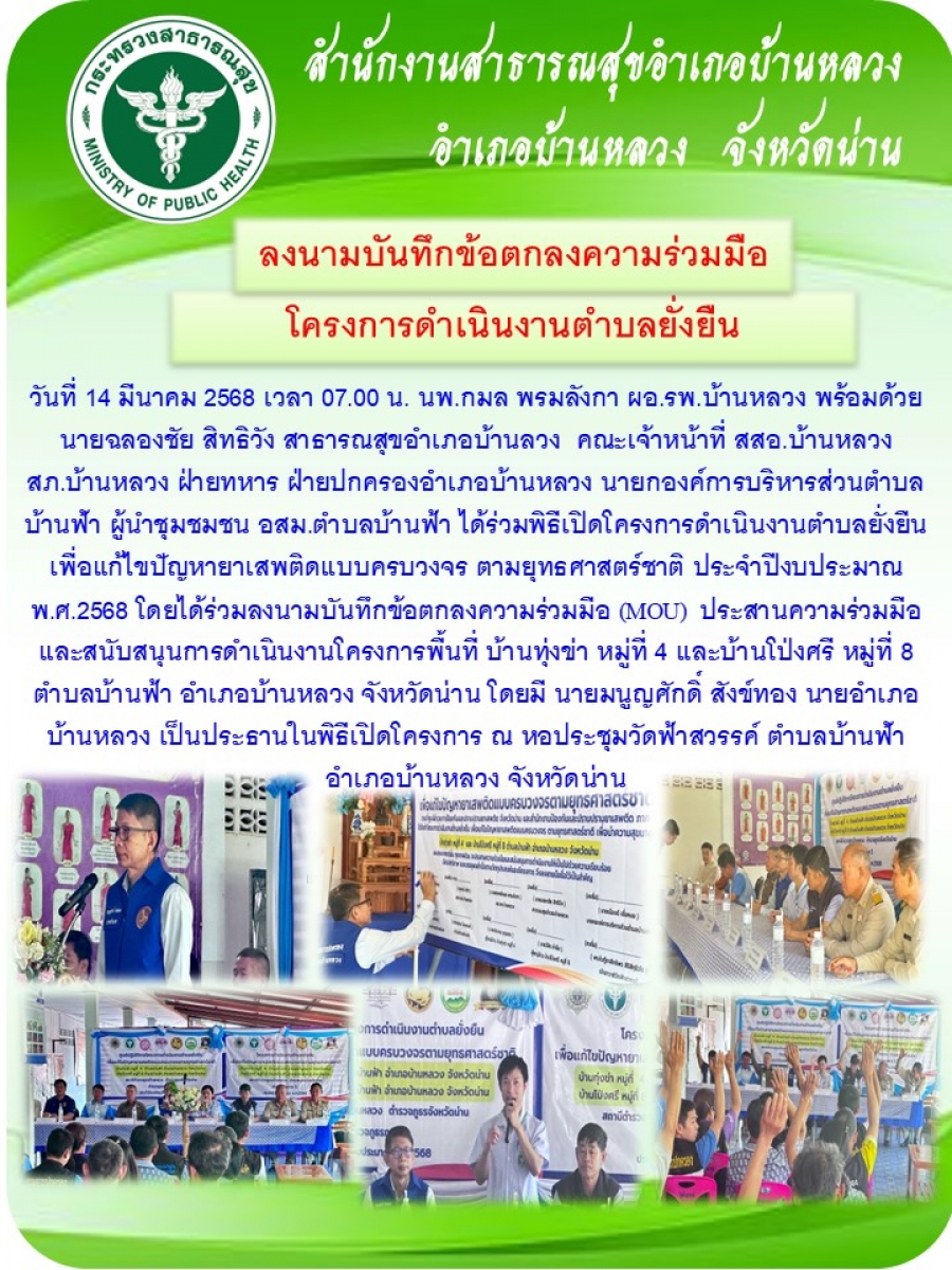 วันที่ 14 มีนาคม 2568 เวลา 07.00 น. นพ.กมล พรมลังกา ผอ.รพ.บ้านหลวง พร้อมด้วย นายฉลองชัย สิทธิวัง สาธารณสุขอำเภอบ้านลวง  คณะเจ้าหน้าที่ สสอ.บ้านหลวง                 สภ.บ้านหลวง ฝ่ายทหาร ฝ่ายปกครองอำเภอบ้านหลวง นายกองค์การบริหารส่วนตำบลบ้านฟ้า ผู้นำชุมชมชน อสม.ตำบลบ้านฟ้า ได้ร่วมพิธีเปิดโครงการดำเนินงานตำบลยั่งยืน เพื่อแก้ไขปัญหายาเสพติดแบบครบวงจร ตามยุทธศาสตร์ชาติ ประจำปีงบประมาณ พ.ศ.2568 โดยได้ร่วมลงนามบันทึกข้อตกลงความร่วมมือ (MOU)  ประสานความร่วมมือ และสนับสนุนการดำเนินงานโครงการพื้นที่ บ้านทุ่งข่า หมู่ที่ 4 และบ้านโป่งศรี หมู่ที่ 8 ตำบลบ้านฟ้า อำเภอบ้านหลวง จังหวัดน่าน โดยมี นายมนูญศักดิ์ สังข์ทอง นายอำเภอบ้านหลวง เป็นประธานในพิธีเปิดโครงการ ณ หอประชุมวัดฟ้าสวรรค์ ตำบลบ้านฟ้า อำเภอบ้านหลวง จังหวัดน่าน