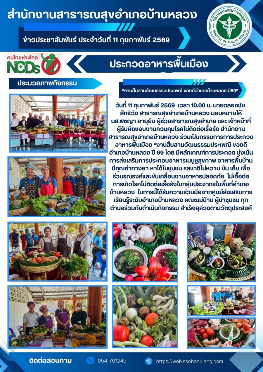 นที่ 11 กุมภาพันธ์ 2569 เวลา 10.00 น. นายฉลองชัย สิทธิวัง สาธารณสุขอำเภอบ้านหลวง มอบหมายให้นส.พิชญา อายุยืน ผู้ช่วยสารารณสุขอำเภอ และ เจ้าหน้าที่ผู้รับผิดชอบงานควบคุมโรคไม่ติดต่อเรื้อรัง สำนักงานสาธารณสุขอำเภอบ้านหลวง ร่วมเป็นกรรมการการประกวดอาหารพื้นเมือง "งานสืบสานวัฒนรรรมประเพณี ของดีอำเภอบ้านหลวง ปี 69" โดย มีหลักเกณฑ์การประกวด มุ่งเน้นการส่งเสริมการประกอบอาหารเมนูชูสูขภาพ อาหารพื้นบ้านมีคุณค่าทางยา หาได้ในชุมชน รสชาติไม่หวาน มัน เค็ม เพื่อร่วมรณรงค์และขับเคลื่อนงานอาหารปลอดภัย ไม่เอื้อต่อการเกิดโรคไม่ติดต่อเรื้อรังในกลุ่มประชากรในพื้นที่อำเภอบ้านหลวง ในการนี้ได้รับความร่วมมือจากศูนย์ส่งเสริมการเรียบรู้ระดับอำเภอบ้านหลวง คณะแม่บ้าน ผู้นำชุมชมชน ทุกตำบลร่วมกันดำเนินกิจกรรม สำเร็จลุล่วงตามอัตถประสงค์